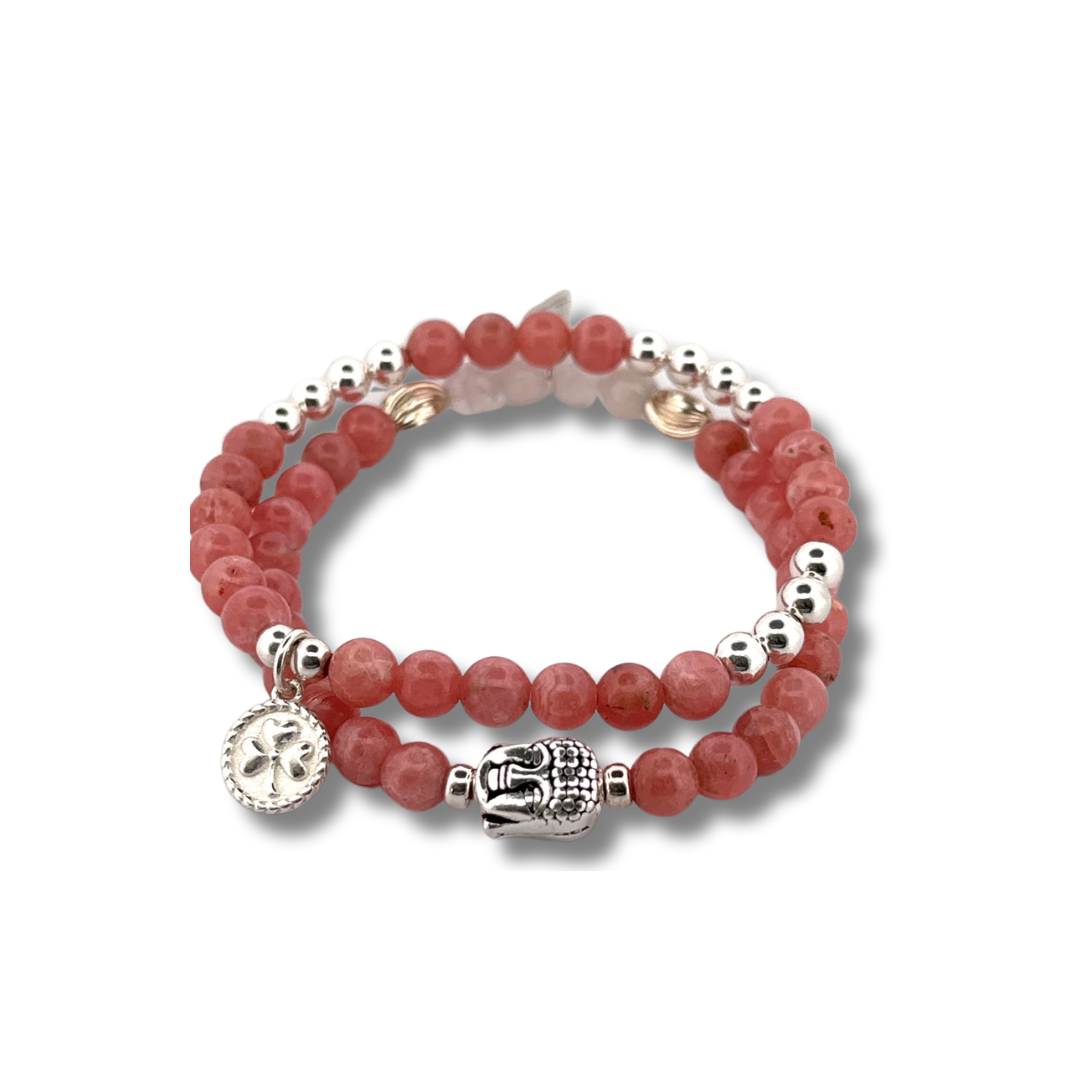Ce magnifique bracelet fait de pierres Rhodonite est fait à la main par la créatrice de ByMarilo. Ces pierres sont enfilées sur un fil élastique qui le rend facile à passer autour du poignet.